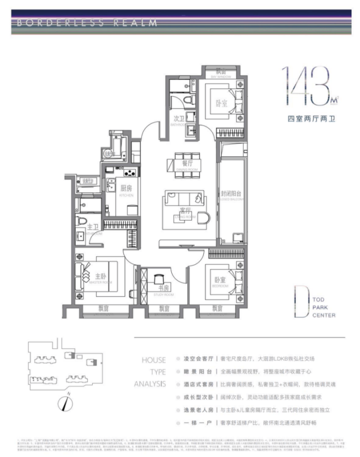 建面约143m²户型特点:超大画幅的岛厅,大洄游LDKB公区格局,IMAX级景观阳台,超奢观景视野,一梯一户尊享级梯户比,南北通透,尊崇感十足!
