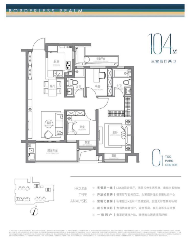 建面约104m²户型特点:LDKB洄游式竖厅+开放式厨房,生活尺度无限拉伸,主卧近6m²灵感空间,承载更多功能可能,成长型的次卧,书房儿童房随心所欲。