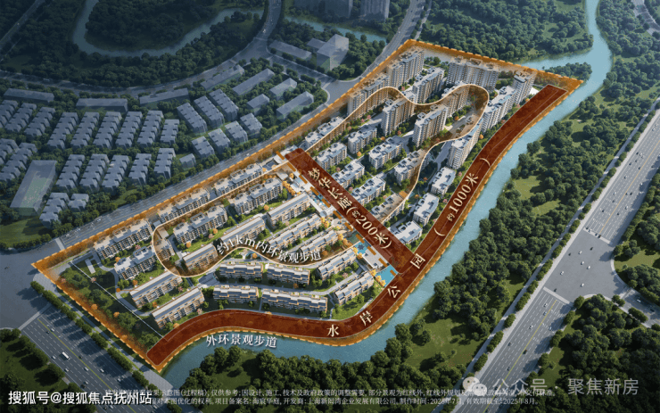 整个地块三面都被绿地与河道包裹,尤其是项目东侧,公共绿地、滨河景观带、城市生态走廊此地排列,天然具备构建多层次景观视域的条件。
