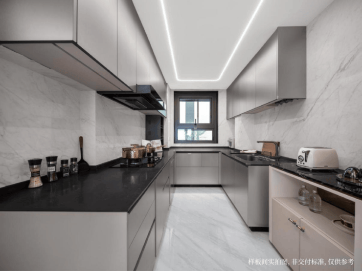 U型厨房的设计同样令人称道,整体面积约7.5㎡,台面总长约5.8米,比常规户型多出25%的操作空间,两人下厨绰绰有余,洗切烹炒盛更高效顺畅,让烹饪成为一种享受。