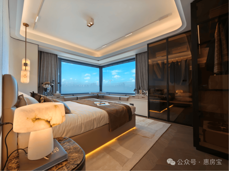 主卧套房设计,边套户型更独享270°超大转角飘窗,将广阔视野与充沛采光一并纳入怀中,无论昼夜晴雨,窗前皆是无遮挡的风景画。地面铺设柳叶拼实木复合地板,温润而富弹性,光脚踩踏也倍感舒适。