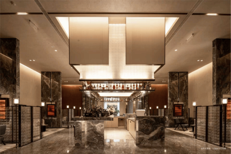 「迎宾楼」穹顶之下的水墨艺术装置,与「行政酒廊」的琥珀色灯光交织;「私宴厅」可定制私人主题宴席,「车马厅」则敬呈望族归家仪轨。