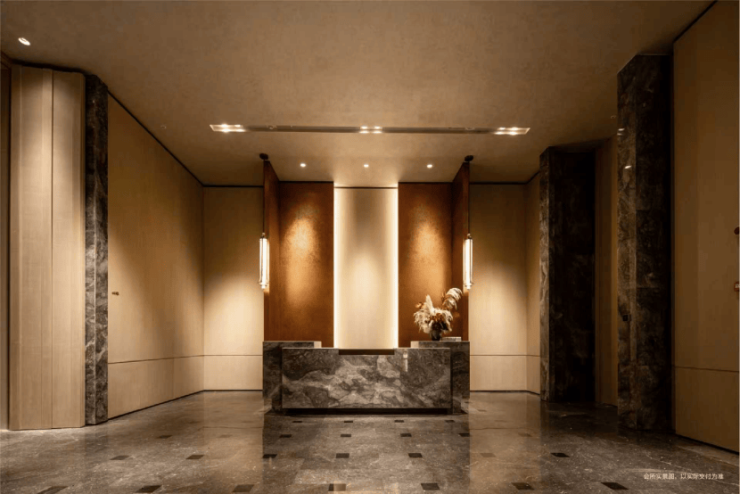 ·威尼斯棕大理石打造的接待台,以古木年轮般的沉稳质感,在光影变幻中流淌出世家大族的时光厚度;