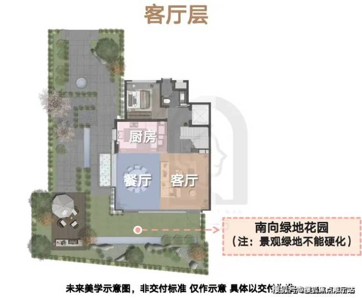 1F客厅层,南向绿地花园衔接客厅,打造四季流转的户外会客厅。