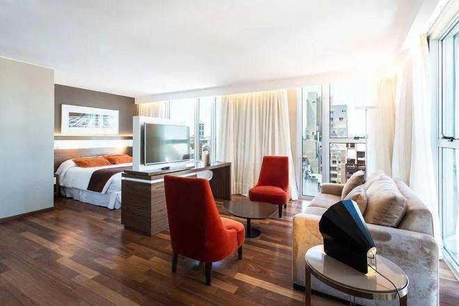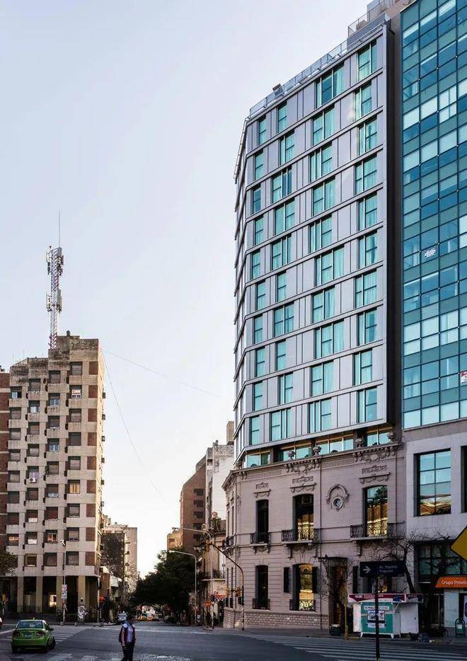 通过这种方式,酒店的前四层在原始立面后方构成现有建筑的一部分,从这里向上延伸其余楼层,外部由结构性玻璃墙覆盖。之后,在侧面街道的相邻地块进行了扩建,通过在底层、一层和二层实现项目连接,打造了一个大型会议厅、员工及服务入口,同时在屋顶新增了一个水疗中心,丰富了酒店的配套设施。其余楼层则设计了客房,与现有客房形成互补。