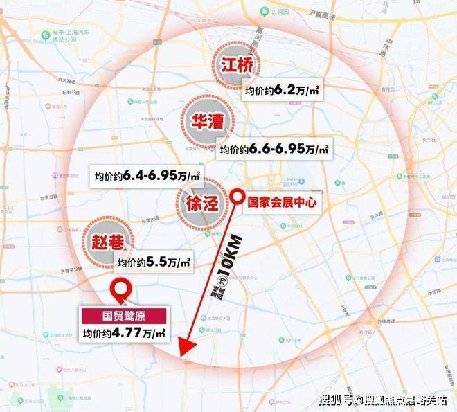 以国展为原点,10公里为半径,来看西虹桥一线辐射区域的房价格局: