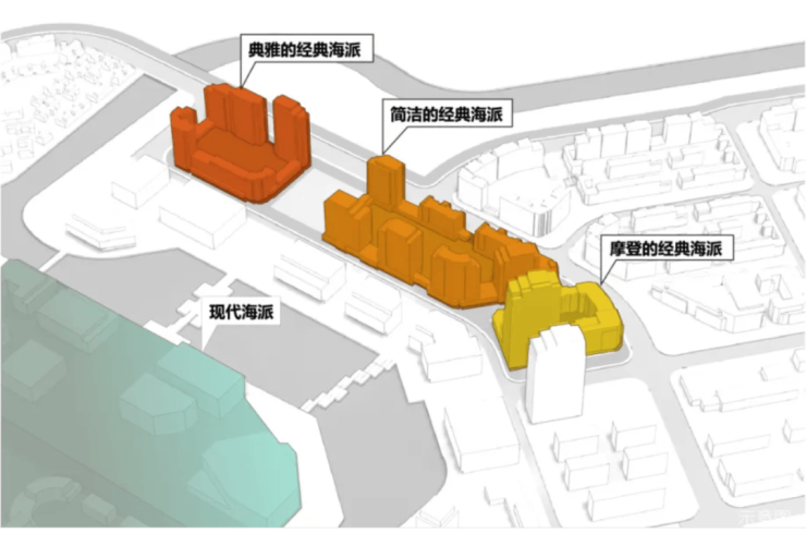 在前滩滨江板块统一的海派风格下,前滩滨江道三个地块,分别演绎出现代海派的三种气质:典雅、简洁、摩登。