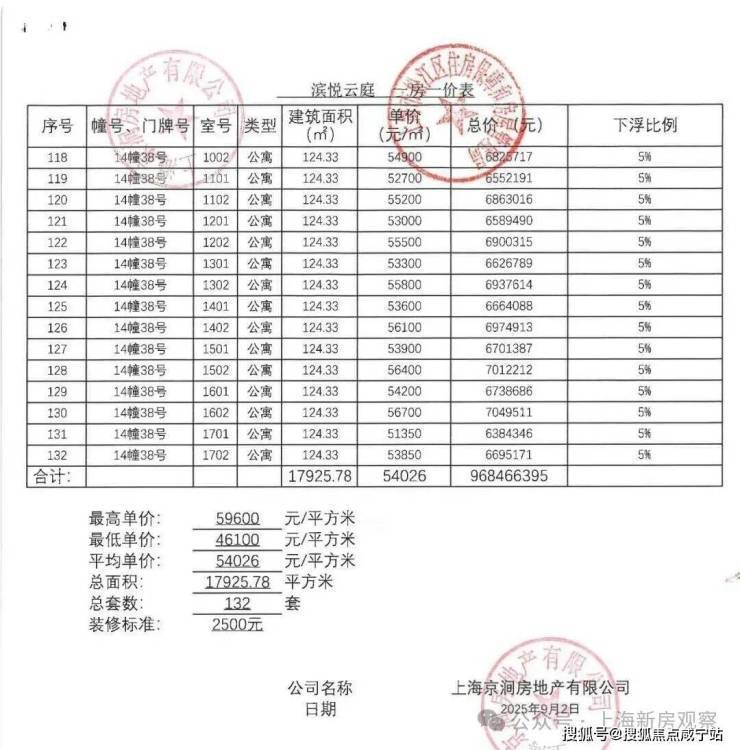 上期一房一价表如下: