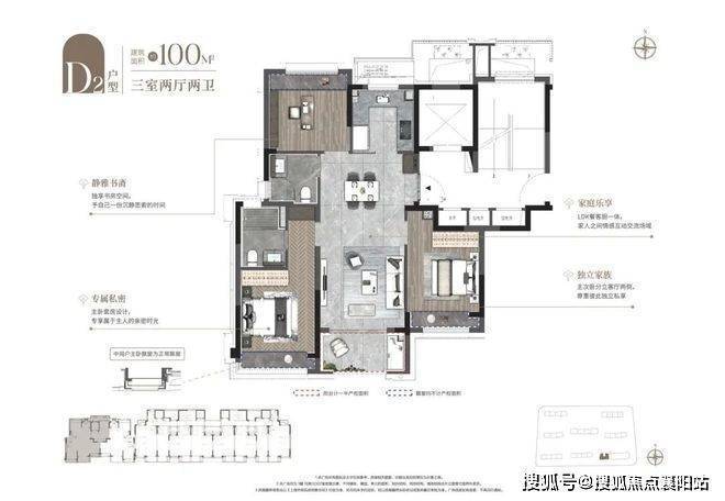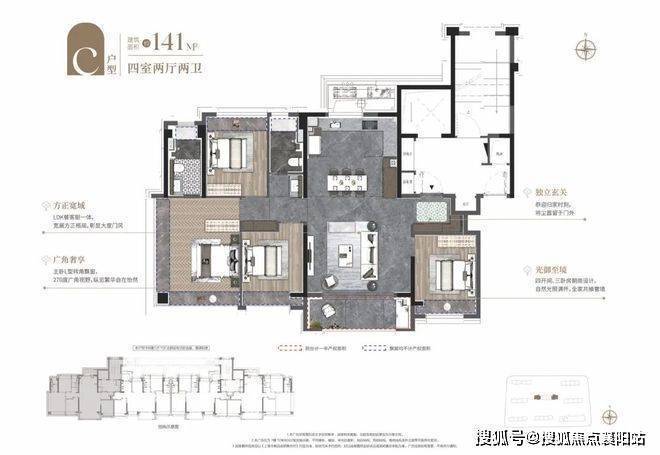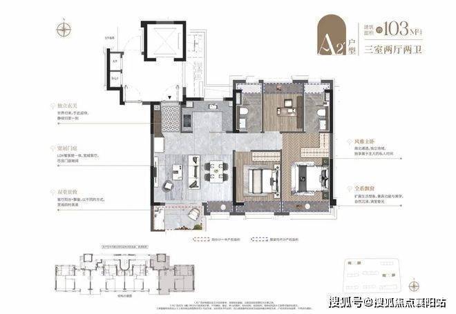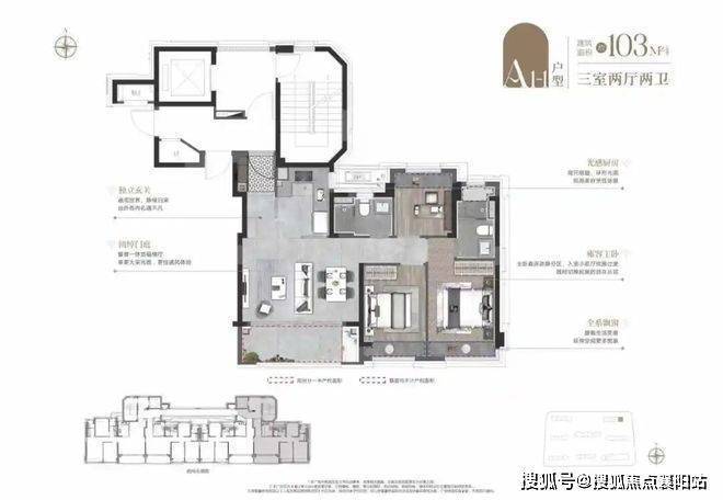 这是项目的明星户型。三开间朝南+大横厅布局,主卧配备270°转角飘窗,实现双倍采光-2。全屋配置5个飘窗,通过飘窗、设备平台的合理赠送,实际使用体验堪比110㎡+的旧户型-4。