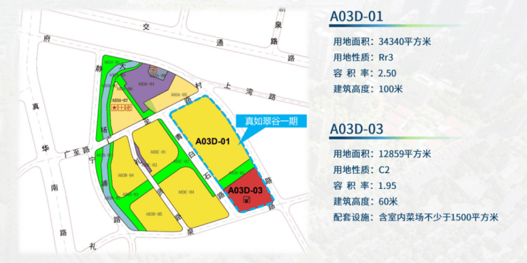 A03D-03地块:出让土地面积12859平方米,土地用途为商业,规划容积率1.95,计容建筑面积25075平方米。
