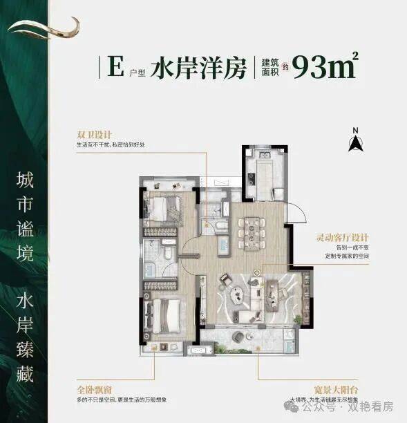 本案采用双景观轴线设计,让业主尊享臻境归家礼遇和隐归自然体验,悦享惬意生活。产品方面,建筑面积约122㎡的水岸联排别墅和56-70-93-127㎡水岸洋房产品搭配,满足不同业主居住体验需求。其中E户型和F户型水岸洋房更是采用大牌精装交付,赋能品质生活。