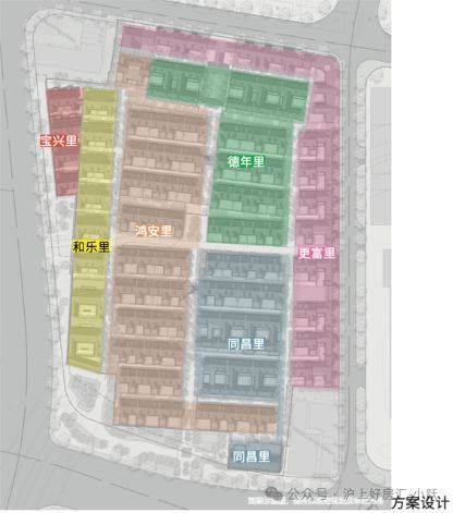 弘安里这块地原由8个街坊组成,其中东寿坊和永安里因后期加建改建较大,体量也很小,为了园区整体考虑,不再保留, 延续了剩余6个组团:德年里、和乐里、宝兴里、更富里和鸿安里。