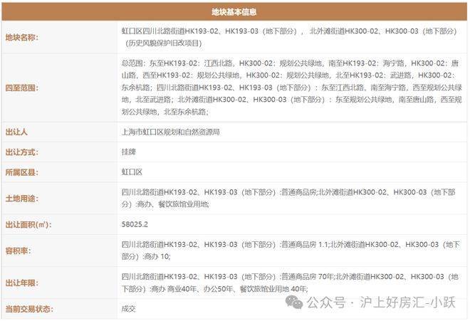 2021年2月,上海虹口城市更新建设发展有限公司(上海地产联合体)以 111.35亿 拿下了 虹口区四川北路街道HK193-02(17街坊弘安里)、HK193-03(地下部分);北外滩街道HK300-02、HK300-03(地下部分)(历史风貌保护旧改项目)