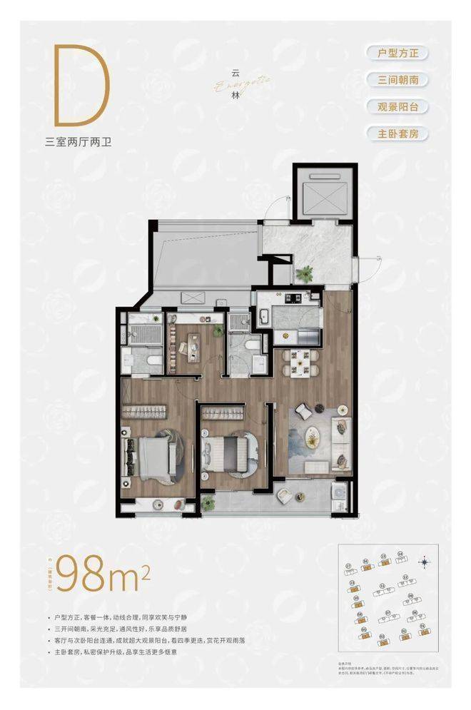 约98㎡3房2卫户型,三开间朝南,并且这贯穿客厅+次卧的超大阳台实在是惹眼,这个南向的视野延展度以及采光度相比同级别的户型来说,陆家嘴锦绣云澜售楼处电话☎:400-8787-740✅✅要更加出色。