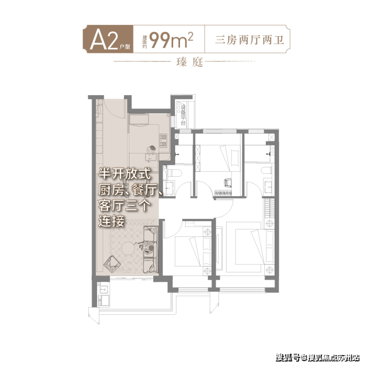 99㎡的户型,三个房间都可以做卧室,无论二胎或三代同堂皆可。