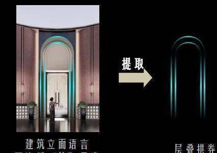 建筑立面:海派石库门+现代玻璃幕墙,基座钻石绿石材+巴西金石材干挂,顶部白玉兰花冠造型,10 m挑高穹顶社区大门复刻外滩和平饭店彩玻穹顶