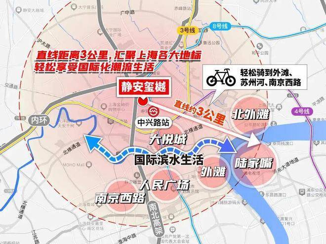 而静安玺樾到外滩和平饭店的直线距离正好是约3公里!妥妥的城心烫金地段!