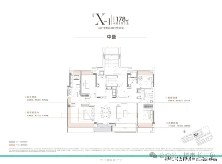 中平户型以四开间朝南的IMAX级采光面,打造出堪比市区豪宅的尺度感。4房4飘窗2阳台的设计,配合双套房布局,一共有三个套房,让每个家庭成员都享有独立私密空间。