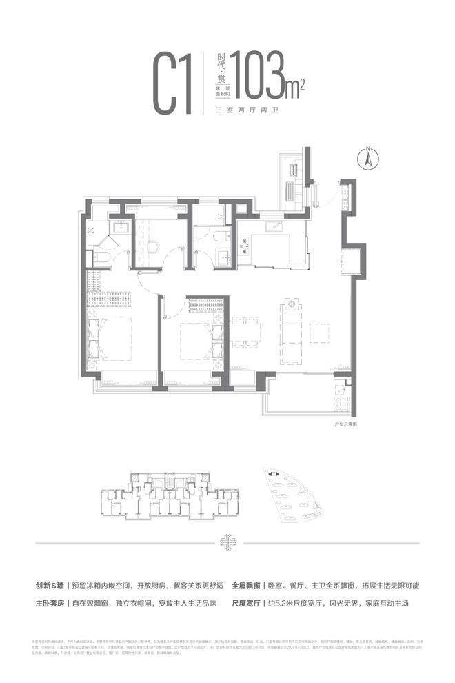 建面约103m²三房两厅两卫户型,南北双卧L型270°揽境飘窗设计,更大限度地让自然融入与自在之中,更宽阔的空间尺度,让自在生长与自然之中。