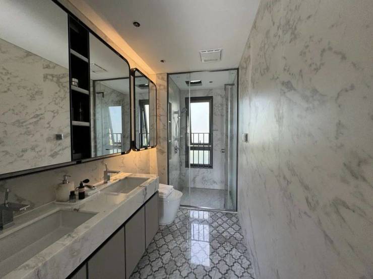 双卫配置,其中一个做了干湿分离,科勒台盆+双智能马桶,除雾镜柜均内置了牙刷消毒器、预留吹风机插座。主卫镜柜还有美妆冰箱,收纳空间相当充足。