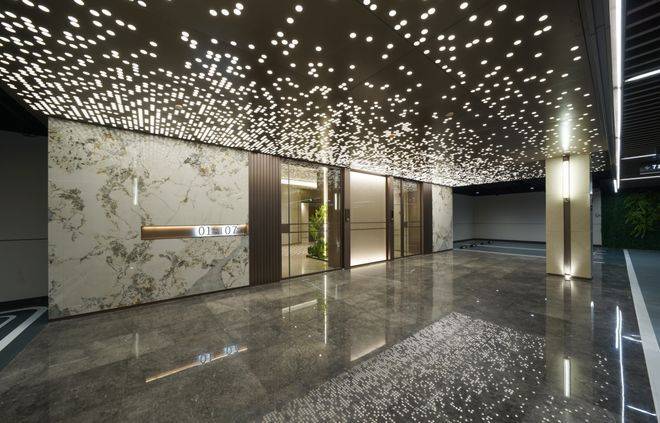 溪山叠翠,作为踏入门厅大堂的首道风景线,巧妙融合约287平方米的灵动水景与精致假山,层次分明,逐步深入,构筑了一幅“山石相依、水景潺潺、绿植环绕”的自然画卷。