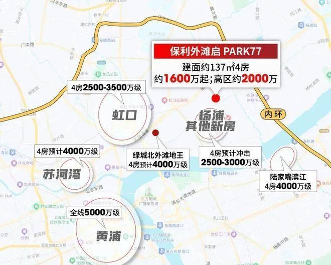 北外滩地王4房预计售价4000万级;虹口其他新房4房价格普遍在2500-3500万;静安苏河湾4房预计4000万级;陆家嘴滨江4房同样4000万级。如此对比之下,保利外滩启PARK77高区2000万级4房的价值,可谓市中心“独一份”。