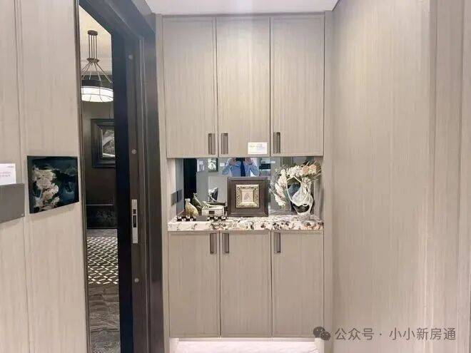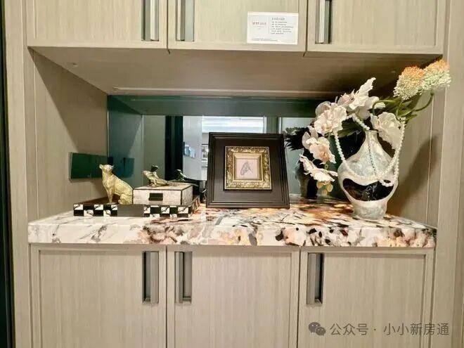 玄关处的柜台面,精选了产自巴西的雪山飞狐奢石。该奢石因其非凡的美感与卓越品质,深受青睐,常用于高端家居及商业空间的装饰。雪山飞狐奢石所呈现的黑白相间的纹理以及其中均匀散布的水晶颗粒,为周遭环境赋予了别具一格的美学意蕴。