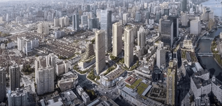 480米的浦西第一高楼以及两座分别高达380米和320米的超高层写字楼鸟瞰浦江。
