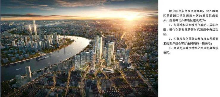 2020年5月13日上海市规划资源局《虹口区北外滩街道控制性详细规划修编》提出,北外滩将按照“最高标准、最好水平”的总体要求,打造“世界级会客厅”和“具有全球影响力的世界级滨水区”为目标,与外滩、陆家嘴共同打造“黄金三角”核心商务区的战略高地。