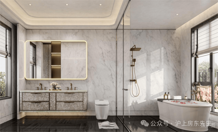 而顶层的主卧大套间,则是墅居生活的至高礼遇——它集步入式衣帽间、豪华卫浴,附带南向约40m²广角全景空中花园,成为一个兼具私密性与景观性的精神自留地。