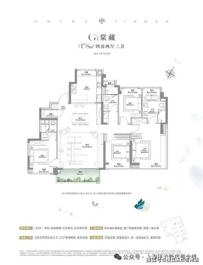 建面约117㎡3房2厅2卫,做到了3+1开间朝南+5个飘窗+主卧套房设计+270°转角飘窗,所有的尺度都有进一步提升。