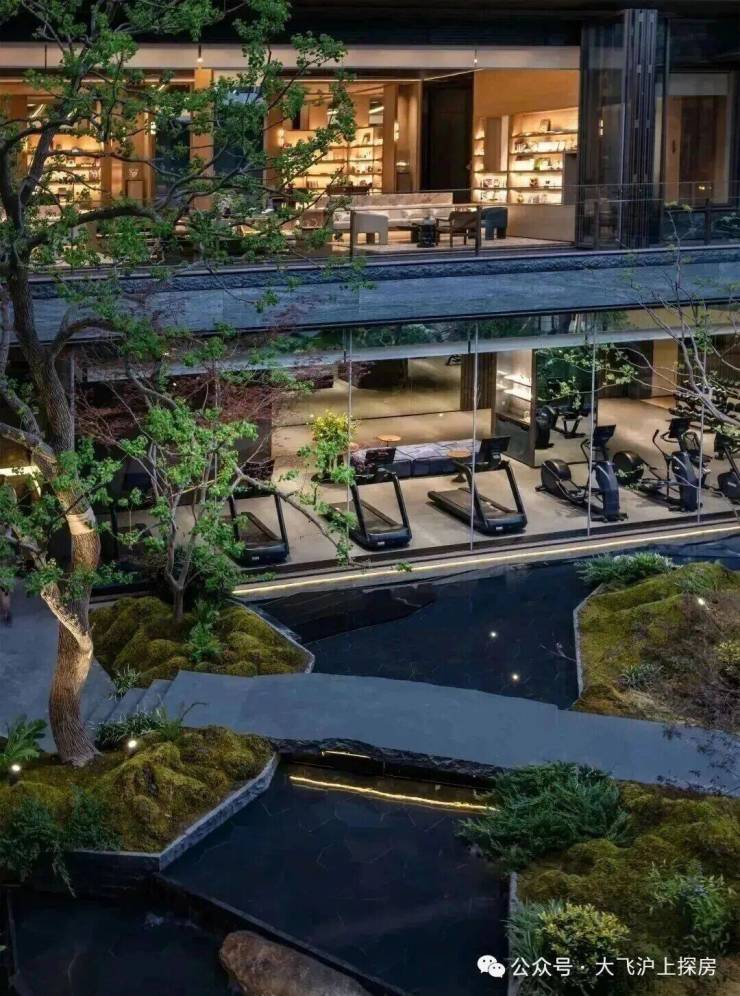 地下区域的健身房直面庭院景观,每台跑步机都正对玻璃中轴,满足"强迫症"用户的极致体验;