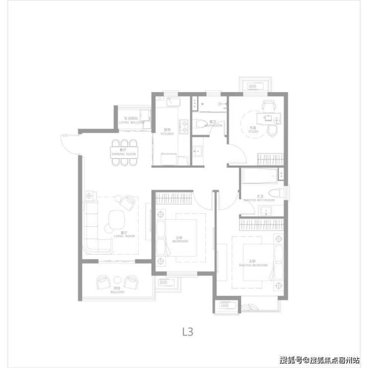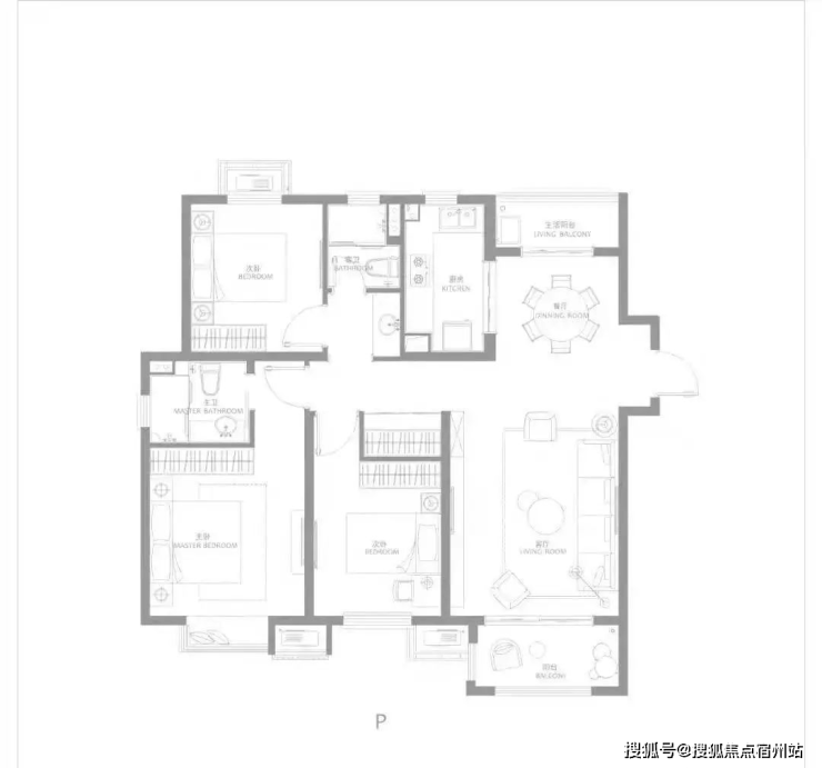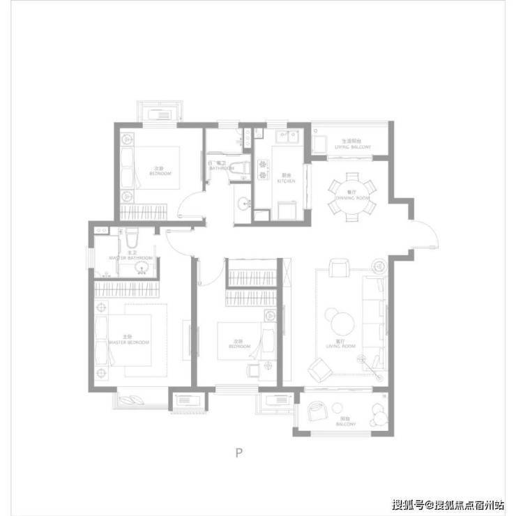 建面约116㎡三房两厅两卫,南北通透,户型方正,主卧大套房,带阳台与独立主卫,更舒适的居住尺度。
