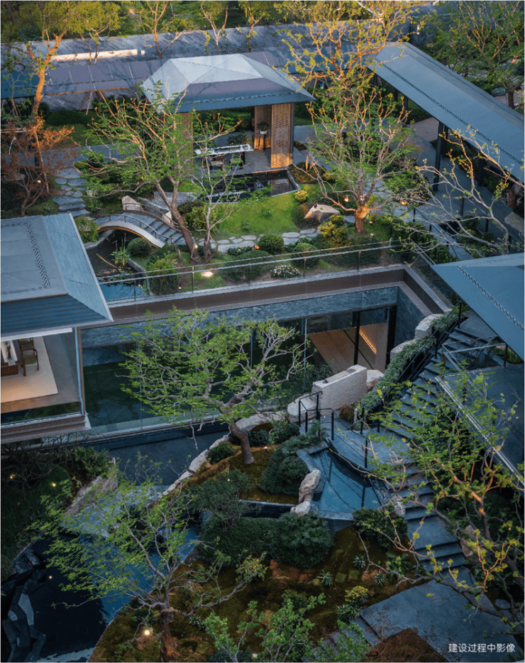 而最令人惊艳的,当属约6米地势差打造的下沉式山水庭院,山、石、水、林有序交织,犹如一幅“豁然开朗”山水轴卷,每一步皆是景致,每一处皆有不同。