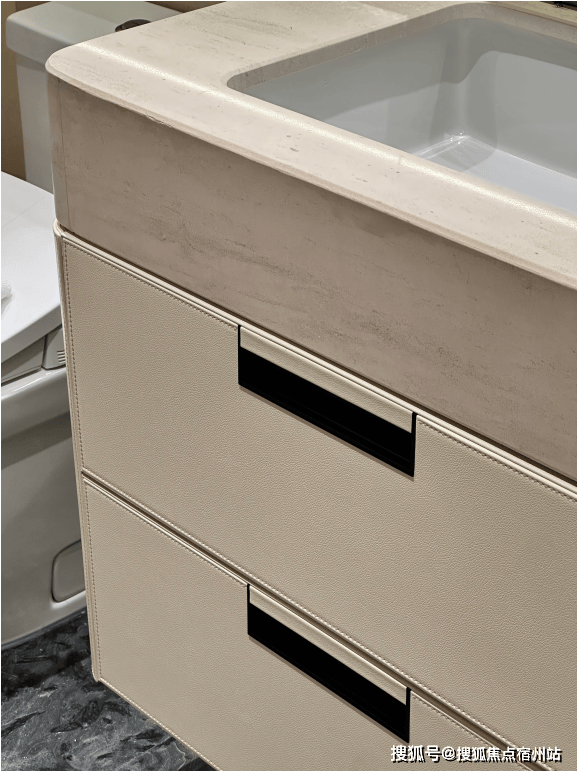 基础硬件都不差,项目在审美上还做了不少创新——卫生间大量采用奢石和石材,比如主卫柜体墙面就是香格里拉翡翠拼花,龙头是冷热分离式,成本更高:次卫则是采用不同风格,墙面统一采用米洞岩板、地面为深咖色瓷砖,黑金配色风格区别于看多了的海派设计,眼前一亮:卫生间下柜同样是皮革包裹交付,标配智能马桶盖板:
