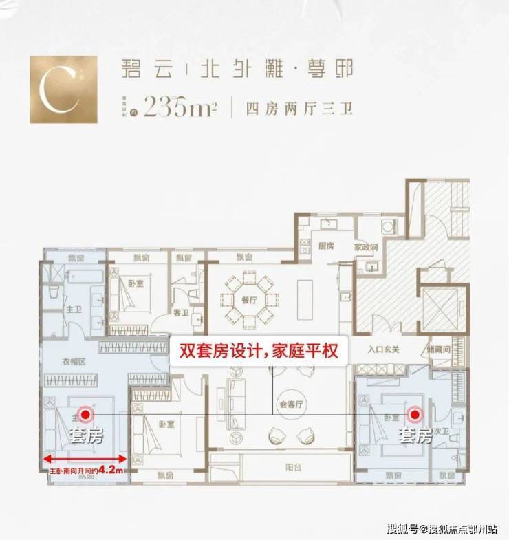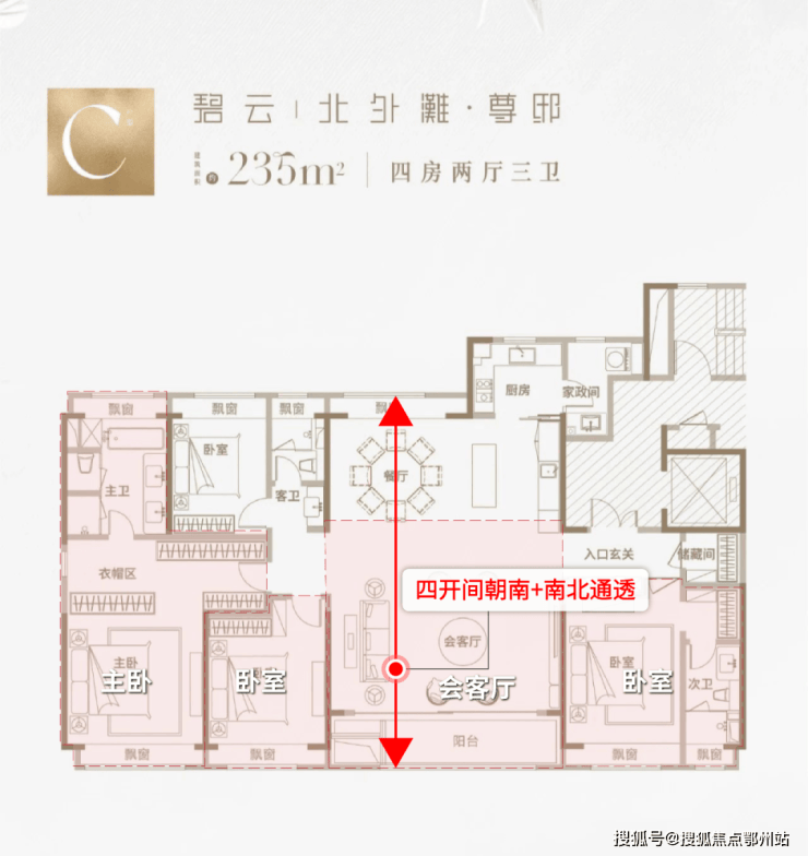 建面约235㎡户型更是做到南北通透+四开间朝南+南向大宽厅的格局,让业主起居之间沐浴充足阳光。