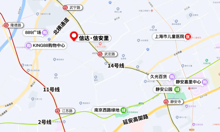 项目地块位于静安历史风貌区内,约1KM范围内有2/7/11/13/14号线,分布武宁路、昌平路、隆德路、静安寺等市中心地铁站。