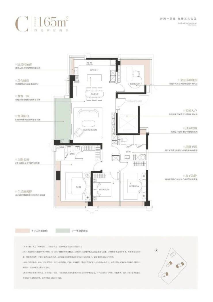 亮点:一梯一户、层高 3.15 米、LDKB 一体化、中西双厨、主卧总统套房