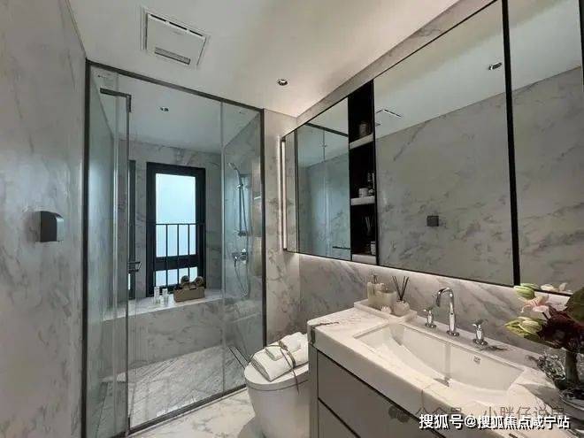 双卫配置,其中一个做了干湿分离,科勒台盆+双智能马桶+高仪花洒,除雾镜柜均内置了牙刷消毒器、预留吹风机插座。主卫镜柜还有美妆冰箱,收纳空间相当充足。招商中旅观境售楼处电话☎:400-9966-940☎️☎️☑️☑️(预约热线)✔✔✔