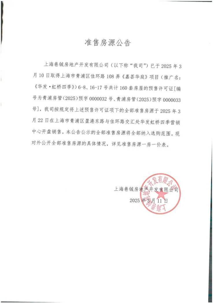 【华发虹桥四季官方公示】