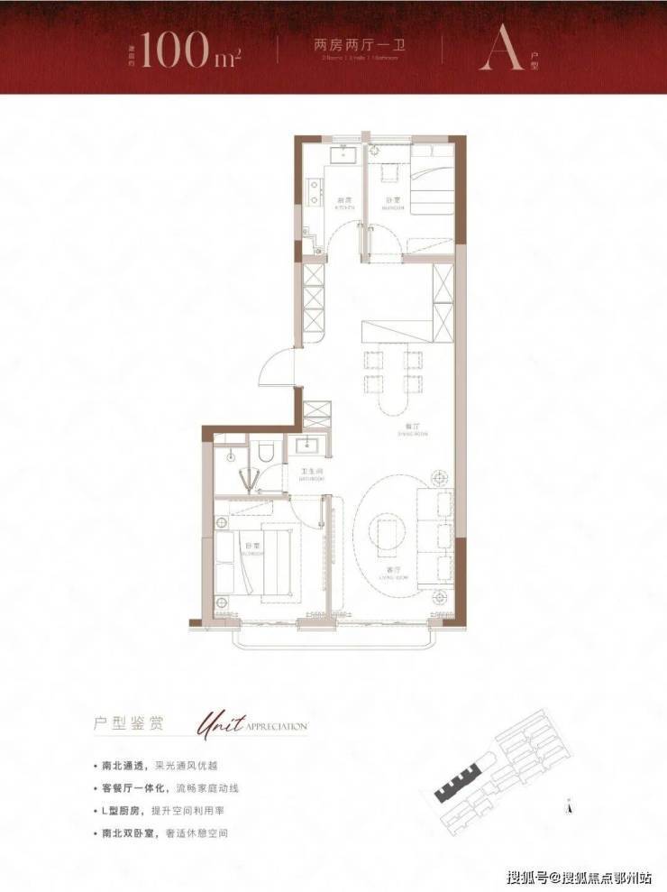 建面约100m²大2房户型,带来的不仅是方正的布局,也为购房者带来了体验感超绝的视野和采光!