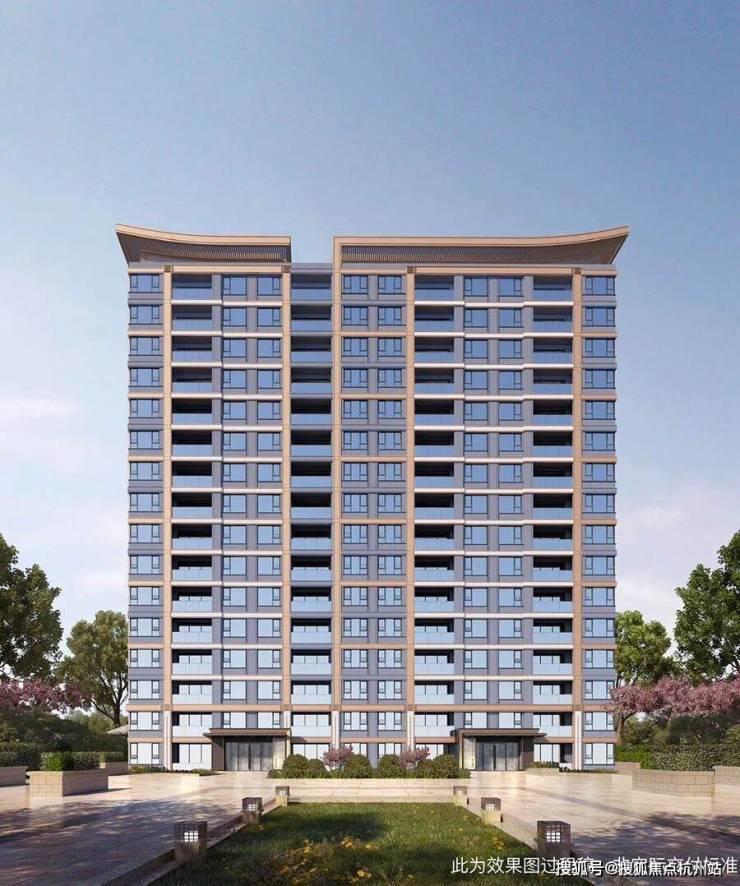 项目建筑外立面主色调为香槟金色与灰色相结合,单元入口部位使用蓝眼睛石材及香槟金色金属;更独特的是,项目 将东方飞檐元素融入现代美学立面, 形成不落俗套,气质清闲,典雅高贵的现代建筑形象, 截取现代潮流元素的同时,亦不失东方大气恢弘之势。