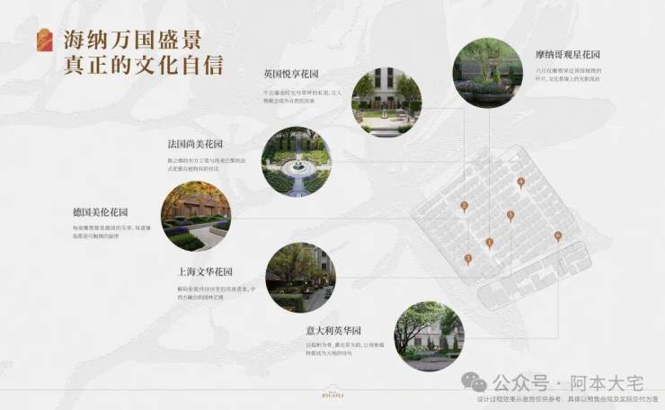 景观设计引入“六大万国花园”,汇集英式、法式、德式、意式等造园体系