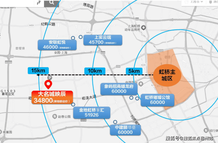 将视野拉大,在青浦,向东赵巷皆 5万+/㎡ ,向西青浦新城、淀山湖大道也都 4.5万+/㎡