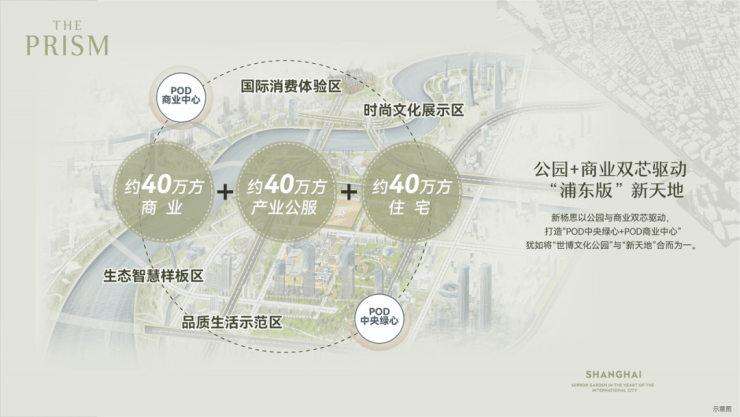 即以公园为导向的功能混合开发模式,围绕公园与商业的“POD中央绿心+POD商业中心”双心驱动。通俗的讲,双pod模式有点类似于浦东版“新天地+世博文化公园”的规划!