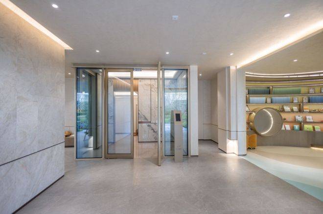 目前售楼处所在位置,未来将作为归家礼序的第一道礼序存在,穿过磅礴大气的门头,进入大堂空间,未来这里将作为配套用房使用,含盖智能快件、养老设施、文化活动等功能场景。