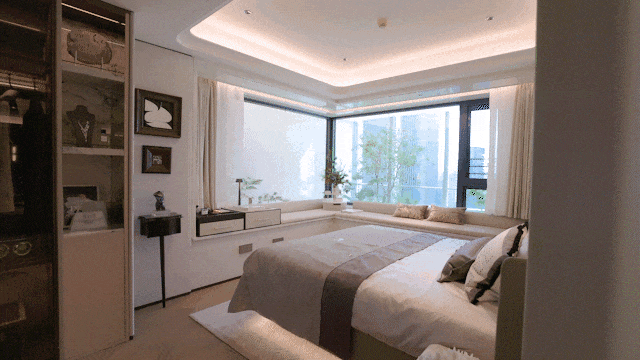 海上清和玺❤️❤️售楼处电话:400 - 1010 - 064❤️❤️主卧约270°L形飘窗设计,将窗外的美景尽收眼底,注重美观的同时,也兼顾了实用性与舒适性,让业主在繁忙的生活中也能享受到宁静与安逸。海上清和玺❤️❤️售楼处电话:400 - 1010 - 064❤️❤️