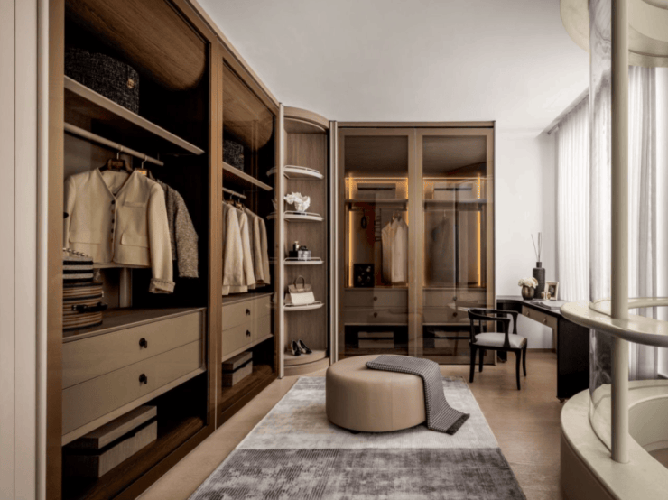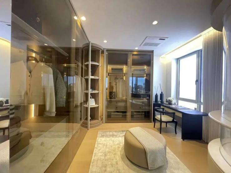 超豪华主卧大面积衣帽间,有专属X空间可以拓展多重功能,比如办公、阅读、品茶等: