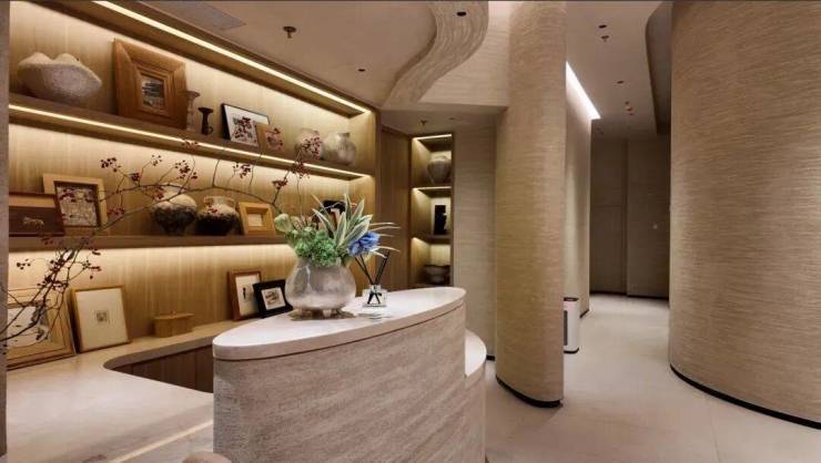 整个空间被大量的木饰面、浅色天然石材与精心布置的灯光所包裹,透出一种宛如黄浦江水的流动律感。