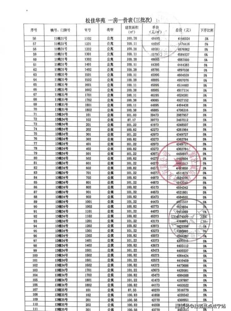 一房一价表如下